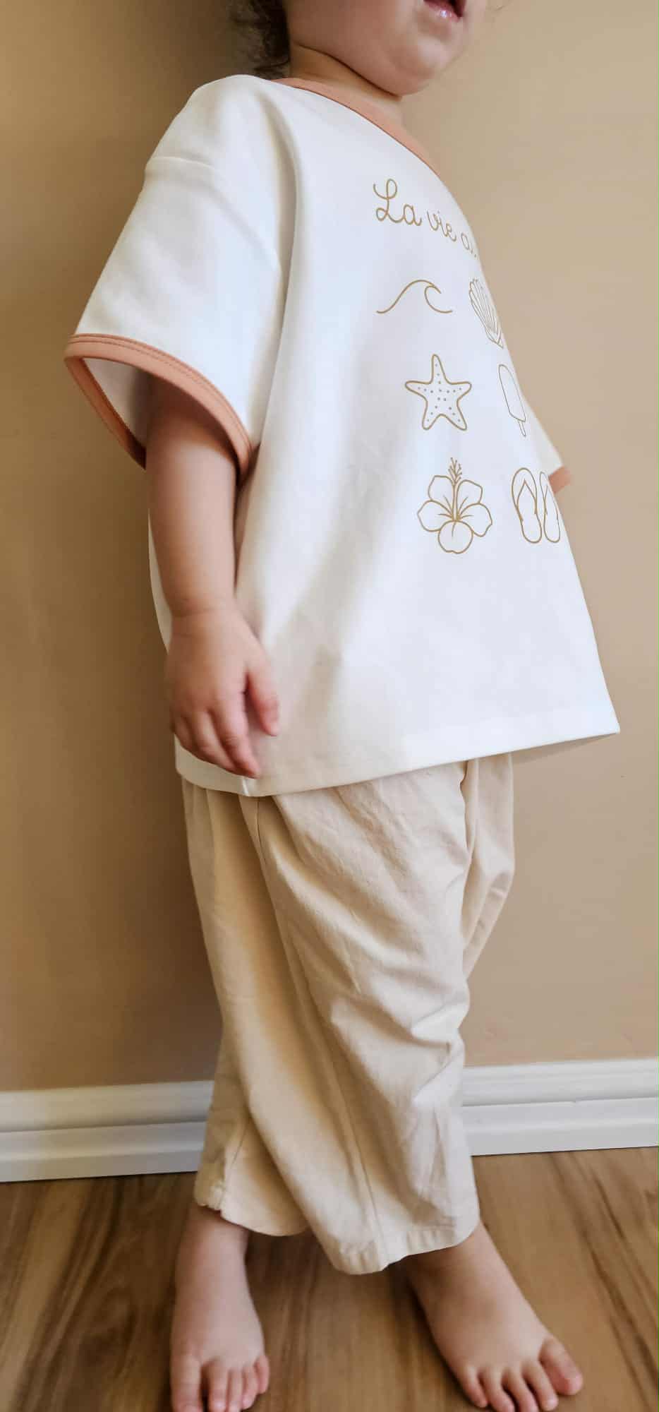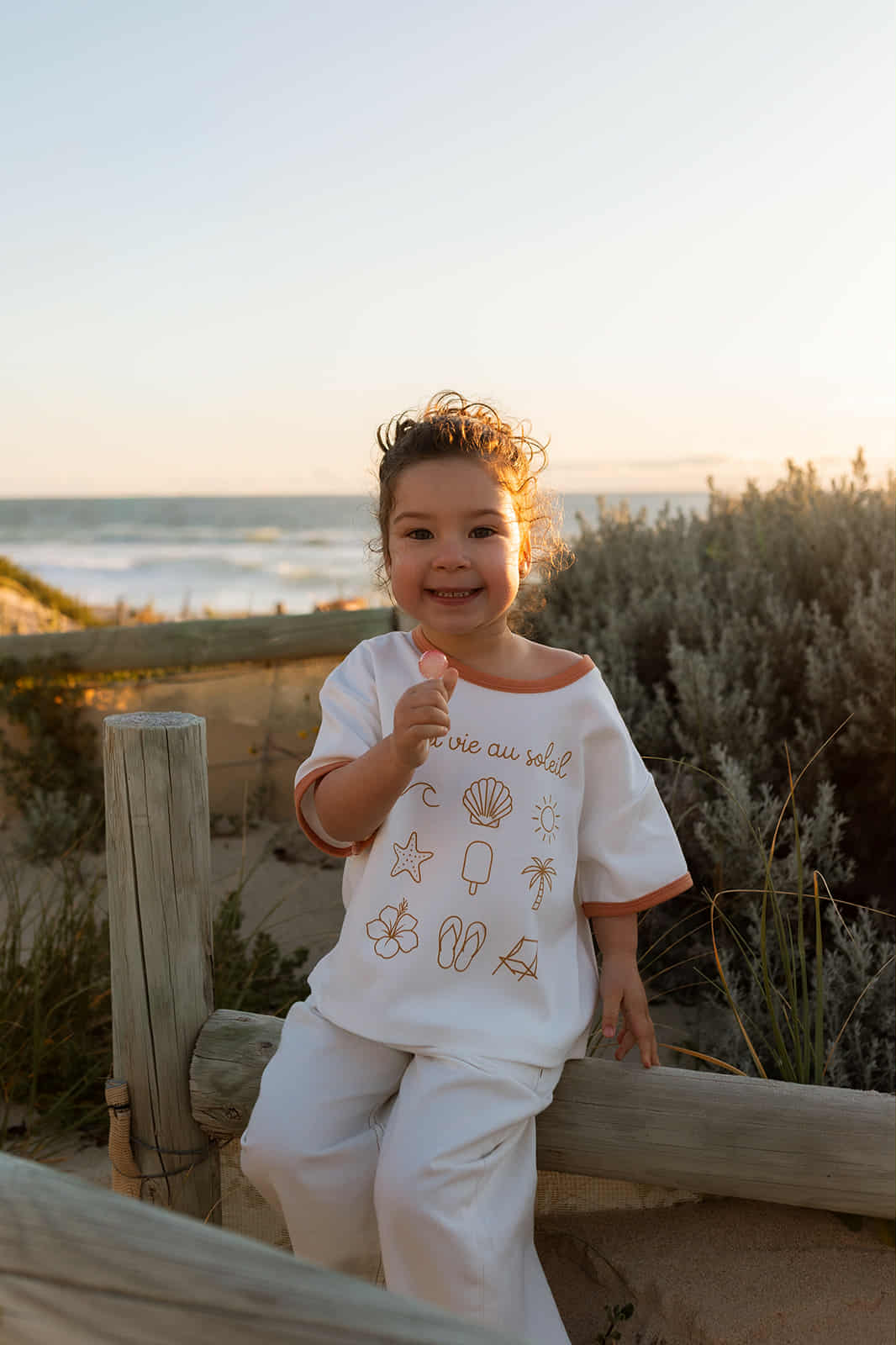A celebration of sunlit days and seaside dreams. This creamy white tee features bronzed accents at the collar and sleeve ends, with the French phrase “La Vie au Soleil” (“Life in the Sun”) printed in warm bronze lettering. On the front, a charming 3×3 grid of beachy icons: wave, shell, sun, starfish, ice cream, palm tree, flower, thongs, and deck chair - captures the essence of carefree coastal living. It’s a wearable mood board for sun-chasers and sand-lovers alike. Crafted from 100% cotton, this t-shirt offers a straight cut and oversized fit, designed for a comfortable and beachy day.