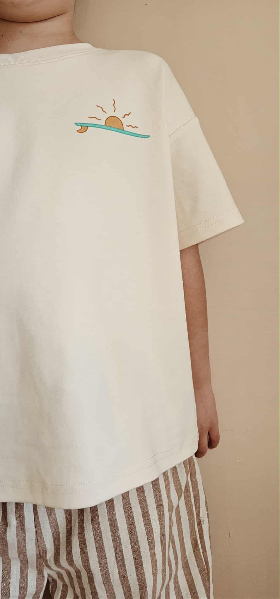 This light cream tee features a small surfboard and setting sun graphic on the left chest: simple, serene, and full of motion. On the back, “Summer Rays” is printed in warm, relaxed lettering, echoing the glow of golden hour. Crafted from 100% cotton, this t-shirt offers a straight cut and oversized fit, designed for a comfortable, gender-neutral vibe.