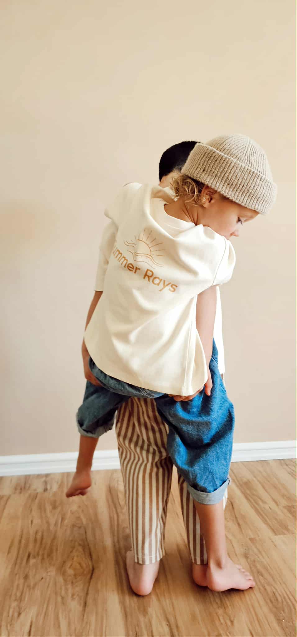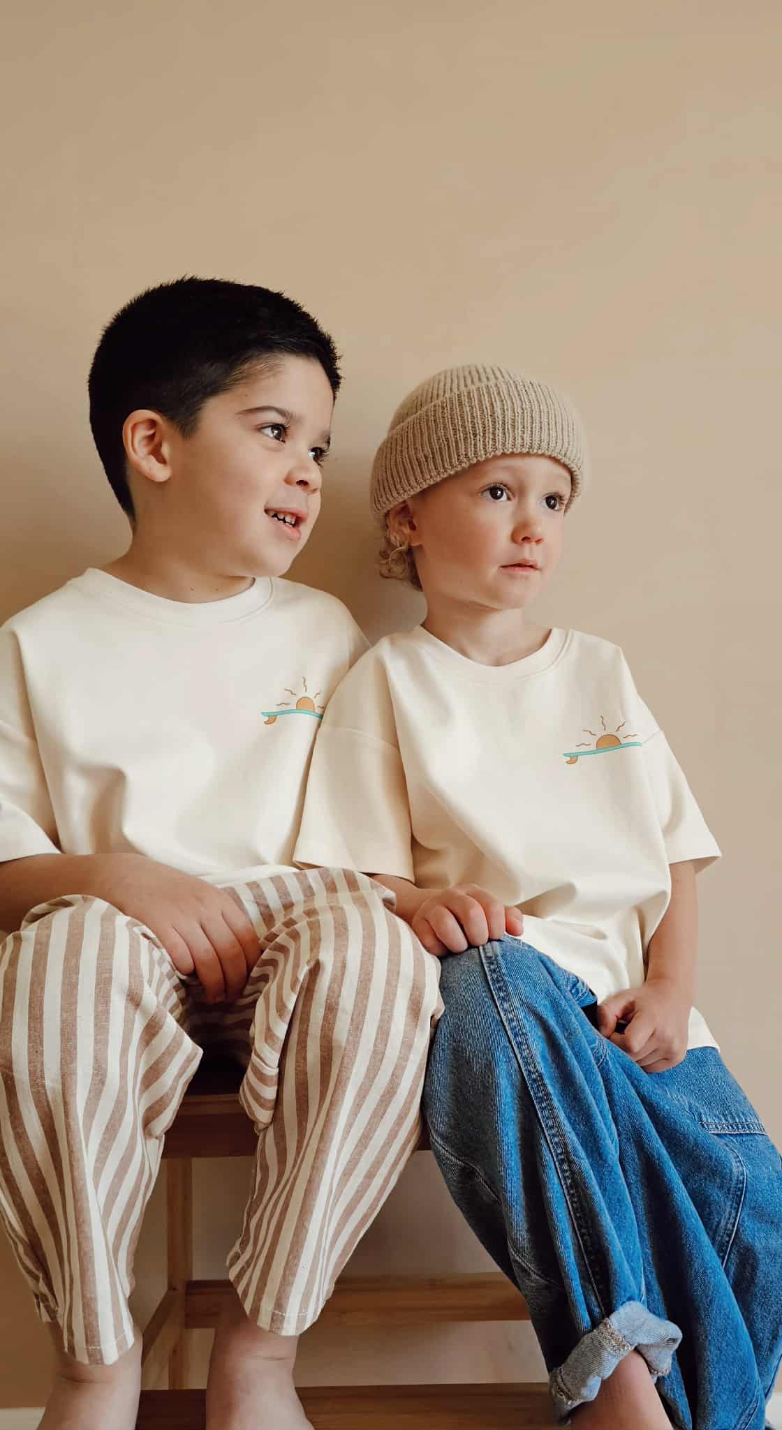 In the first photo, Jacob is wearing size 5-6 and Kai size 3-4