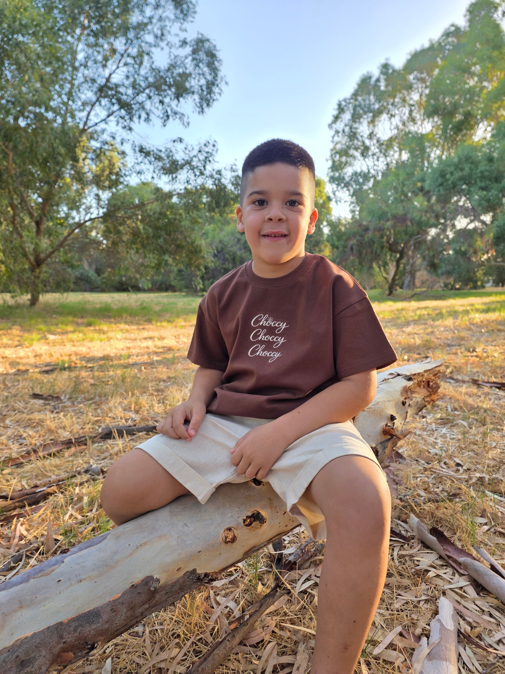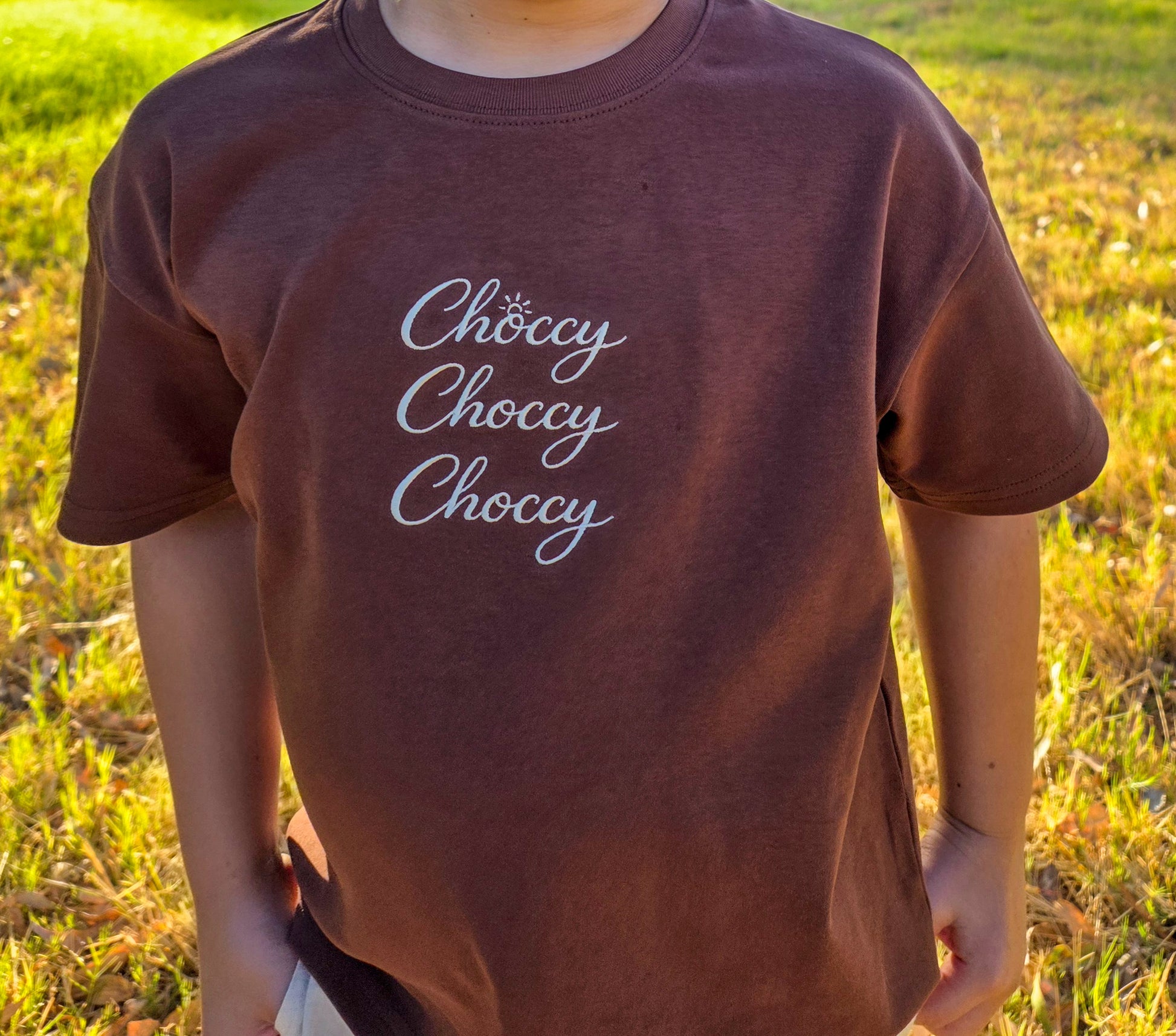 Inspired by the cozy, chocolatey tones of Easter treats, this tee features a rich mocha‑brown base with soft white script repeating “Choccy Choccy Choccy.” A tiny sun sparkles above the first word, adding that signature Summer Rays warmth.